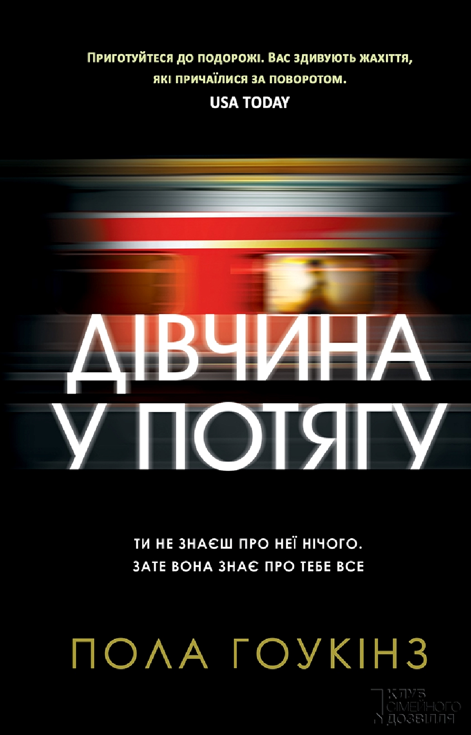 Книга Поли Гоукінз «Дівчина у потягу» стала бестселером «The New York Times» і протрималася на першому місці 16 тижнів. За кілька місяців в світі продано більше 3 мільйонів примірників, а кількість перекладів на іноземні мови наближується до п`ятидесяти. Українською книгу переклала Інна Паненко. Джесс і Джейсон, такі імена дала Рейчел «бездоганному» подружжю, за життям яких вона день за днем спостерігає з вікна електрички. У них, схоже, є все, чого зовсім недавно позбулася сама Рейчел, - любов, щастя, благополуччя . Але одного разу, під час поїздки, вона бачить, як в дворику котеджу, де живуть Джесс і Джейсон, відбувається щось дивне, загадкове, шокуюче. Всього хвилина - і потяг знову рушає, але цього достатньо, щоб ідеальна картинка зникла назавжди. Рейчел розуміє, що тільки вона, можливо, здатна розгадати таємницю зникнення Джесс. Що робити? І чи треба взагалі їй втручатися в чуже життя?