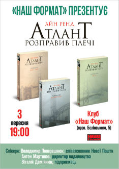 3 вересня, о 19.00, у клубі «Наш Формат» (пров. Ч. Бєлінського, 5) відбудеться презентація всієї трилогії Айн Ренд «Атлант розправив плечі».