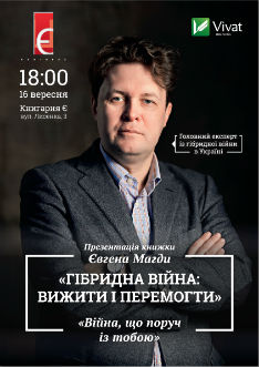 16 вересня, 18.00, в книгарні «Є» (вул. Лисенка, 3), відбудеться зустріч з політологом Євгеном Магдою та презентація його книжки «Гібридна війна: вижити і перемогти», що побачила світ у видавництві «Віват».