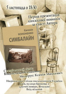 У четвер, 5 листопада, о 18.30, у Вітальні маєтку Лібермана, більше знаному як Національна Спілка письменників України (вулиця Банкова, 2), відбудеться перша презентація нової книжки метра короткої прози Євгенії Кононенко «Симбалайн».