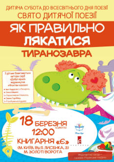 Хто така Лякація? А тиранозавр Оленка? І чи треба їх лякатися? В кого носи незрівнянної краси? І як скачати братика з інтернету? Про це все добре знають поети Іван Андрусяк, Олеся Мамчич і Олена Горобець. На святі дитячої поезії ви зможете почути, як вони читають свої поезії, а також побавитися в захоплюючі поетичні ігри. А художниця Світлана Сова поділиться секретами створення барвистих ілюстрацій до книжки-перевертуна Олесі Мамчич «Тиранозавр Оленка» і Олени Горобець «Горобці-молодці». Гарний поетичний настрій вам гарантований!