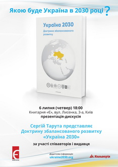 Книгарня «Є» та Видавництво «Кальварія»запрошують 6 липня (четвер) о 18:00 до київської книгарні «Є» за адресою вул. Лисенка, 3-а відбудеться презентація-дискусія видання «Україна 2030: Доктрина збалансованого розвитку» за участі автора ідеї та співавторів Доктрини.