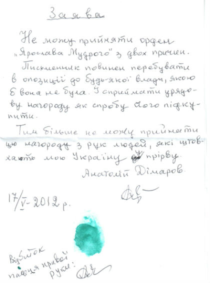 Письменник Дімаров відмовився від ордена Ярослава Мудрого (копія заяви)