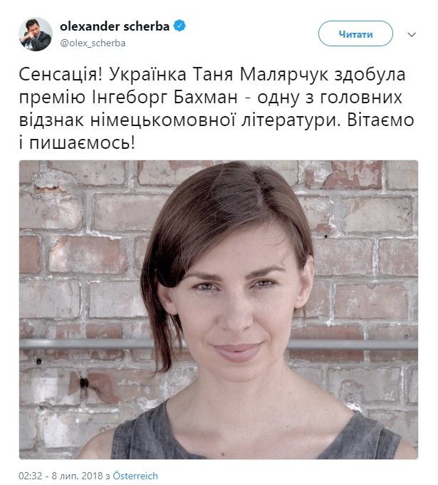 «Українка Таня Малярчук отримала премію Інгеборг Бахман - одну з головних відзнак німецькомовної літератури. Вітаємо і пишаємося», - написав Щерба.