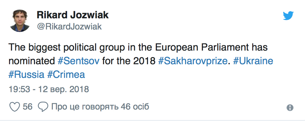 «Найбільша політична група в Європарламенті висунула Сенцова на премію Сахарова 2018 року», – написав журналіст.