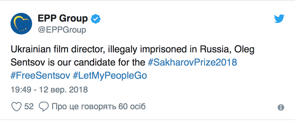 «Український кінорежисер, незаконно ув’язнений у Росії, Олег Сенцов є нашим кандидатом на премію Сахарова у 2018 році», – йдеться у повідомленні. Також в ЄНП додали хештег #FreeSentsov із закликом звільнити Сенцова.