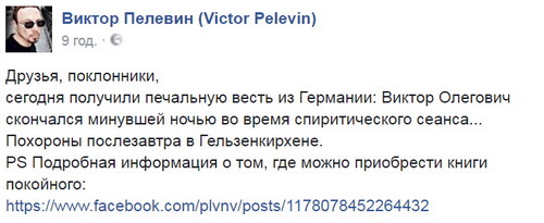 На фан-сторінці у Facebook Віктора Пєлєвіна зявилося повідомлення про смерть письменника.
