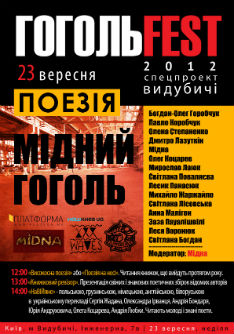 23 вересня з 12.00 до 15.00 на Міжнародному фестивалі сучасного мистецтва «ГОГОЛЬFEST-2012» працюватиме поетична сцена.