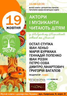 19 жовтня об 11.00-12.30 на ІІІ Фестивалі української дитячої книги «Азбукове Королівство Магів та Янголів», що відбудеться у Музеї книги і друкарства України (вул. Лаврська, 9, корп. 9, пов. 1, зала 1, територія Києво-Печерської лаври) актори і музиканти читатимуть дітям.