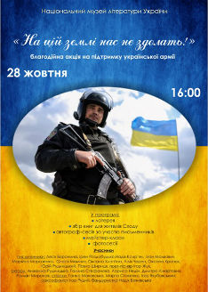 Сьогодні, 28 жовтня, о 16.00, в Національному музеї літератури України (вул. Б. Хмельницького, 11) розпочнеться благодійна акція, під час якої збиратимуться кошти для допомоги українським бійцям на Сході.