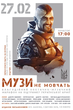27 лютого, о 17.00 (актова зала, 1-й поверх) у Будинку письменників (вул. Банкова, 2) відбудеться благодійний поетично-музичний марафон на підтримку української армії –«Музи не мовчать».