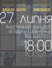 27 липня в Києві відбудеться акустичний концерт Заплановані виступи гуртів: «Колір Ночі» (музиканти зі Ржищева, які виконують соціальний рок), MniShek (у своїй творчості музиканти поєднують...